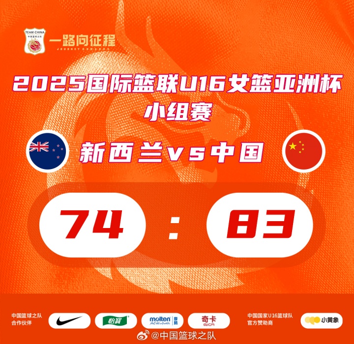 比赛开始,双方开场势均力敌,比分始终紧咬,新西兰持续发力打出8-1的攻击波,孙璇三分引领球队7-0的攻势还以颜色,次节中国队连中三分一举将分差拉开到两位数,新西兰轮番冲击内线得手止住颓势,半场战罢中国U16女篮37-26领先新西兰U16女篮。易边再战,两队围绕10分的分差展开激烈争夺,新西兰队外线开炮频频飙中三分,中国队多点开花强势回应,李沅珊手感火热,内外开花高效拿分帮助球队占据场上主动,新西兰队奋力反击追到3分,孙晗昀关键抛投稳定军心。最终,中国U16女篮83-74击败新西兰U16女篮。