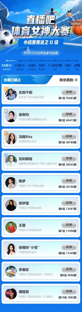 ①志田千阳(95683票)、②俞俐均(69475票)、③冯雨Rita(46788票)、④瓦利耶娃(28245票)。