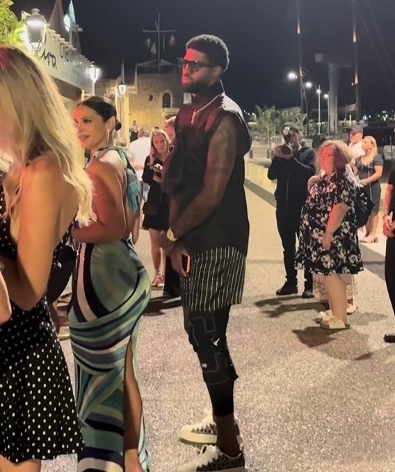 乔治在夜店门口排队,还戴着护膝。身前站着的是他的妻子Daniela